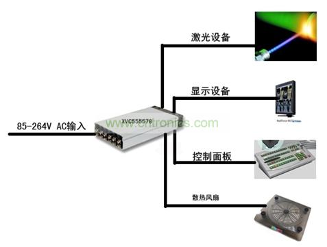 設備總功率約為1,100W,滿足醫療設備認證,需要四組不同直流輸出,首先是大電流的48V、20A用於激光設備, 其次需要一個18V用於LCD顯示器,再次需要一個5V用於控製麵板,最後還需要一個12V用於係統散熱風扇。這個客戶找了很多品牌的產品都無法定型,因為電源係統太複雜,價格太高,占用的空間太大,最後他選擇了Excelsys,在40.5×260×127mm(1U高)的封裝內解決了問題。