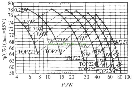寬範圍輸入的交流電壓為85~ 265 V, 在這種條件下,TOP221~ TOP227 係列單片開關電源的P D,η,Po 關係曲線如下,見圖3、圖4。