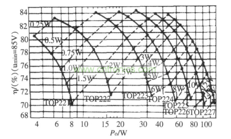 例如,設計輸出5 V, 30 W 的通用開關電源時,就要選擇圖3.因為通用開關電源輸入交流電壓範圍85~ 265 V.首先從橫坐標上找到Po = 30 W 的輸出功率點,然後垂直上移,與T OP224 的實線相交於一點,由縱坐標上查出該點的η= 71.2%,最後從經過這點的那條等值線上,查得PD = 2.5 W.這表明,選擇TOP224 就能輸出30 W 功率,並且預期的電源效率為71.2%,芯片功耗為2.5 W.如果覺得指標效率偏低,還可以繼續往上查TOP225 的實線。同理,選擇TOP225 也能輸出30 W 的功率,而預期的電源效率可以提高到75%,芯片功耗可以降低1.7 W.然後根據所得到的PD 值,還可以進而完成散熱片設計。