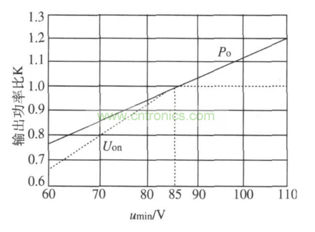 PD ,η, Po 關係曲線均對交流輸入電壓的最小值進行了限製,umin = 85 V.如果交流輸入電壓最小值不符合上述的要求,就會直接影響芯片的正確選擇。此時必須從實際的交流輸入電壓u? min最小值對應的功率P''o 折算成umin為規定值時的等效功率Po,才能使用上麵的圖。功率修正的方法如下: 選擇使用的特性曲線,然後根據已知的u''min值查出折算係數K;將P ''o折算成umin為規定值時的等效功率Po,表達公式P o=P''o / K;然後從圖3、圖4 中選用適當的關係曲線。