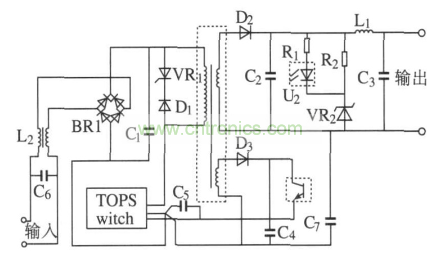 圖6給出了由TOPSwitch 構成的反激式電源的原理圖。其工作過程如下: 輸入交流電經整流橋BR1 整流後再經電容C1 濾波,變為脈動的直流電。