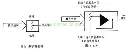 利用數字輸入控製微調模擬輸出有兩種選擇:數字電位器和數/模轉換器(DAC),兩者均采用數字輸入控製模擬輸出。通過數字電位器可以調整模擬電壓;通過DAC既可以調整電流,也可以調整電壓。電位器有三個模擬連接端:高端、抽頭端(或模擬輸出)和低端(見圖1a)。DAC具有隊應的三個端點:高端對應於正基準電壓,抽頭端對應於DAC輸出,低端則可能對應於接地端或負基準電壓端(見圖1b)。