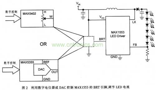 但在當前的許多應用中,DAC與數字電位器之間選擇的界限比較模糊,圖2中的DAC和數字電位器都可用於控製MAXl553 LED驅動器。MAXll53亮度(BRT)輸入的直流電壓和檢流電阻決定了LED的電流。