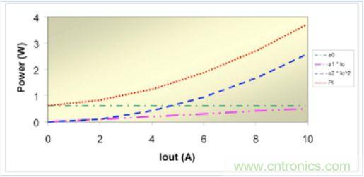 如果意識到電源損耗與輸出電流相關(可用輸出電流替換 X),那麼係數項就能很好地與不同來源的電源功率損耗聯係起來。例如,ao 代表諸如柵極驅動、偏壓電源和磁芯的固定開銷損耗以及功率晶體管 Coss 充電與放電之類的損耗。這些損耗與輸出電流無關。第二項相關聯的損耗 a1 直接與輸出電流相關,其典型表現為輸出二極管損耗和開關損耗。在輸出二極管中,大多數損耗是由於結電壓引起的,因此損耗會隨著輸出電流成比例地增加。