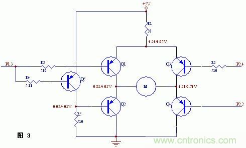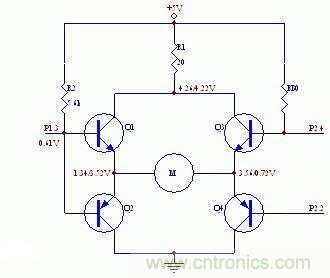 但實際實驗情況去出人意料,即電機正向和反向都不轉。經測量,當P1.3高電平,P2.2和P2.4都為低電平時,Q4導通,但Q1不導通,P1.3的電平隻有0.67V左右,這樣Q1無法導通。