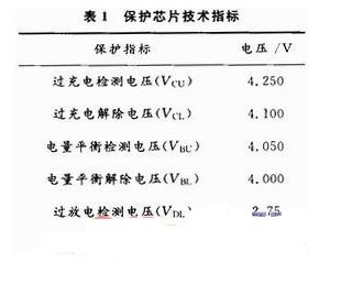 圖5摘取了保護板1中前三級(1~3級)保護電路,6~10級保護電路與此相似。所選取的芯片技術指標如表1所示,對於過充電、電平衡和過放電功能都有其檢測和解除電壓,以確保各狀態的可靠進入和退出。