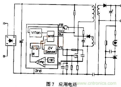 由(9),(10)或可知,調節輸出功率、穩wen定ding輸shu出chu電dian壓ya可ke以yi調tiao節jie導dao通tong時shi間jian或huo占zhan空kong比bi或huo調tiao頻pin方fang式shi或huo幾ji種zhong方fang式shi綜zong合he應ying用yong。當dang輸shu出chu功gong率lv下xia降jiang或huo電dian源yuan電dian壓ya上shang升sheng,導dao通tong時shi間jian減jian小xiao,反fan之zhi導dao通tong時shi間jian增zeng加jia;隨輸出功率的增加或減小變壓器初次級電流峰值均增加或減小,由式(3)可知變壓器的釋放儲能時間也隨之增加或減少,為實現“零電壓”開關,變壓器不能工作在間歇狀態,因此F%IM控製方式不能滿足本文電路的“零電壓”開通的要求。基於上述工作條件的約束,本文電路應采用輸出電壓反饋控製導通時間,用“零電壓”檢測控製開關管導通時刻,即調頻、調占空比工作方式。具體電路可以采用通用器件組合,如圖7。