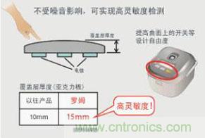 tongchang,duiyudianrongshikaiguanlaishuo,yitigaolingmindu,kangzaoyinxingnengjiuhuibiancha,lingminduyukangzaoyinxingnengcunzaixianghumaodundeguanxi。luomuliyongsuoshanchangdemonijishuyouhualedianlu,tigaolezaoyindepanbiegongneng,congershigaolingminduyugaokangzaoyinxingnengjiande。yinci,gaichanpinzaizuihouda15mm的覆蓋層中也可使用,與開關電極之間的布線距離可達1m,是普通產品的約2倍。在采用了曲麵麵板的設備和大型白色家電等以往很難搭載電容式開關的設備中的應用也更加簡單容易。
