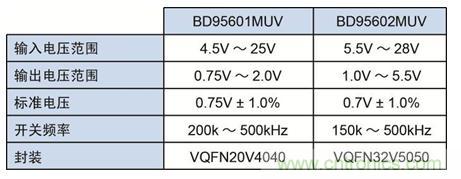 使這些FPGA可靠地啟動、穩定地工作的開關穩壓控製器“BD95601MUV(1ch)”、“BD95602MUV(2ch)”的主要規格如下。
