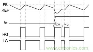 …………(公式)●tON後HG一旦關斷,低邊MOSFET的柵極(LG)導通,FB引腳電壓開始下降,當與REF電壓達到一致時關斷LG。