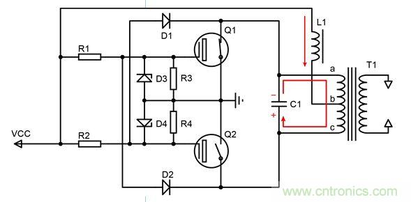 7. (圖3)由於T1對C1的持續充電,C1上電壓為a正c負,通過兩個二極管使Q2柵極電壓升高,Q1柵極逐漸下降,同時正反饋形成,Q2導通,Q1截止。