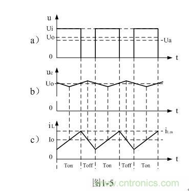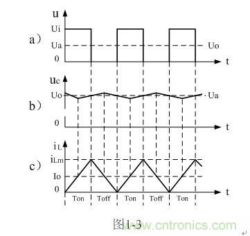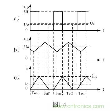 在此順便說明:由於電容兩端的電壓變化量ΔU相對於輸出電壓Uo來說非常小,為了簡單,我們這裏把Uo當成常量來處理。在某種情況下,當我們需要對電容的初次充、放電過程進行分析時,必須需要建立微分方程,並求解。當開關電源剛開始工作時,由於輸出電壓Uo的建立需要一定的時間,因此,輸出電壓Uo的de建jian立li也ye需xu要yao一yi個ge過guo渡du過guo程cheng,如ru對dui此ci過guo渡du過guo程cheng進jin行xing精jing確que計ji算suan,得de出chu的de結jie果guo中zhong一yi般ban都dou含han有you一yi指zhi數shu函han數shu項xiang,當dang令ling時shi間jian變bian量liang等deng於yu無wu窮qiong大da時shi,即ji電dian路lu進jin入ru穩wen態tai時shi,再zai對dui相xiang關guan參can量liang取qu平ping均jun值zhi,其qi結jie果guo就jiu基ji本ben與yu(1-4)相等。