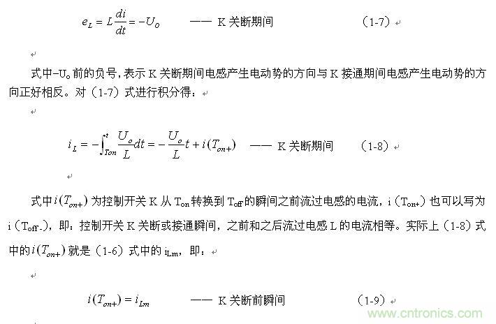 串聯式開關電源最好工作於電流臨界連續狀態,或連續電流狀態。此時,開關電源輸出電壓的調整率為最好,且輸出電壓Uo的紋波也不大。因此,我們可以從電流臨界連續狀態著手進行分析。我們先看(1-6)式: