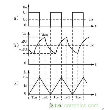 圖1-6中,電容兩端的充放電曲線是有意把它的曲率放大了的,實際上它們的變化曲率並沒有那麼大。因為儲能濾波電感L和儲能濾波電容構成的時間常數相對於控製開關的接通或關斷時間來說非常大(正弦曲線的周期:T =