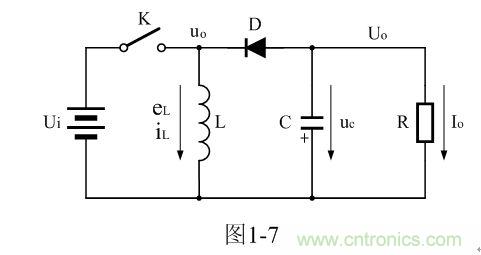 圖1-7中,Ui為輸入電源,K為控製開關,L為儲能電感,D為整流二極管,C為儲能濾波電容,R為負載電阻。當控製開關K接通的時候,輸入電源Ui開始對儲能電感L加電,流過儲能電感L的電流開始增加,同時電流在儲能電感中也要產生磁場;當控製開關K由接通轉為關斷的時候,儲能電感會產生反電動勢,使電流繼續流動,並通過整流二極管D進行整流,再經電容儲能濾波,然後向負載R提供電流輸出。控製開關K不斷地反複接通和關斷過程,在負載R上就可以得到一個負極性的電壓輸出。