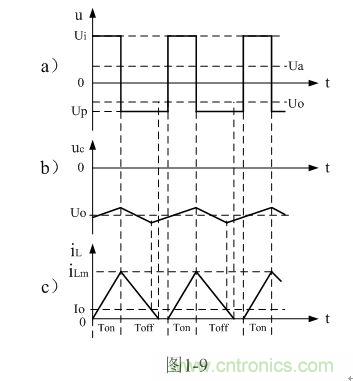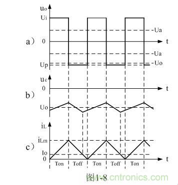 圖1-8、圖1-9、圖1-10分別是控製開關K的占空比D等於0.5、< 0.5、> 0.5時,圖1-7電路中幾個關鍵點的電壓和電流波形。圖1-8-a)、圖1-9-a)、圖1-10-a)分別為控製開關K輸出電壓uo的波形;圖1-8-b)、圖1-9-b)、圖1-10-b)分別為儲能濾波電容兩端電壓uc的波形;圖1-8-c)、圖1-9-c)、圖1-10-c)分別為流過儲能電感L電流iL的波形。應該特別注意的是,圖1-8-c)、圖1-9-c)、圖1-10-c)中的電流波形按原理應該取負值,但取負值後反而覺得與前麵圖1-5與圖1-6不好對比和分析,因此,當進行具體計算時,一定要注意電流和電壓的方向。