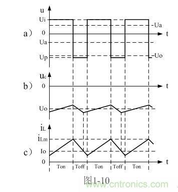 順便指出,反轉式串聯開關電源輸出電壓為負脈衝,當圖1-7中的濾波電容器C開路時,負脈衝的幅度將非常高,負脈衝是一個幅度按指數規律下降的尖脈衝,其幅度主要由負載電阻的大小,以及占空比來決定;當圖7中的濾波電容器C接入後,反轉式串聯開關電源輸出電壓uo為一負方波,此方波我們可稱之為半波平均值,關於半波平均值的概念我們後麵還會詳細解釋。