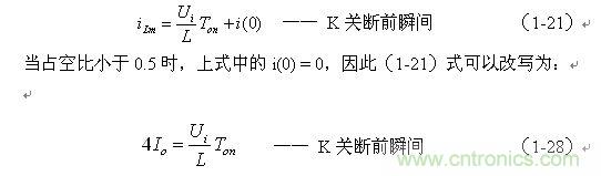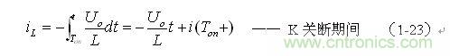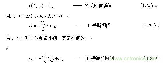 上式中i(Ton+)為控製開關K從Ton轉換到Toff的瞬間流過電感的電流,i(Ton+)也可以寫為i(Toff-),即:控製開關K關斷或接通瞬間,之前和之後流過電感L的電流相等。實際上(1-23)式中的i(Ton+)就是(1-21)式中的iLm,即: