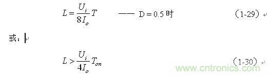 (1-29)和(1-30)式,就是計算反轉式串聯開關電源中儲能電感的公式。同理,(1-29)和(1-30)式的計算結果,隻給出了計算反轉式串聯開關電源儲能電感L的中間值,或平均值,由於輸出電流的不確定性,實際應用時,可以以此為極限,在此平均值的計算結果上再乘以一個大於1的係數。
