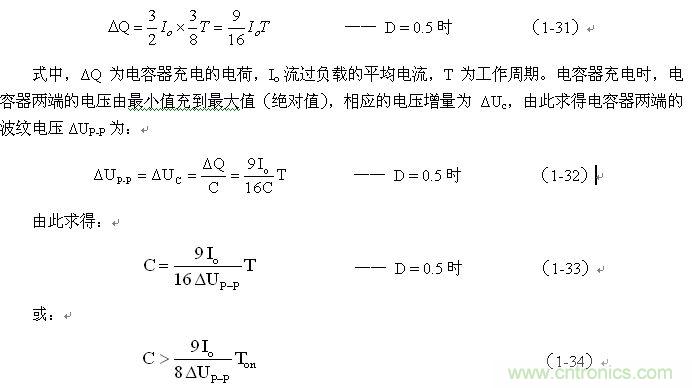 (1-33)和(1-34)式,就是計算反轉式串聯開關電源儲能濾波電容的公式(D = 0.5時)。式中:Io是流過負載電流的平均值,T為開關工作周期,ΔUP-P為濾波輸出電壓的波紋。一般波紋電壓都是取峰-峰值,因此,當D = 0.5時,波紋電壓正好等於電容器充電的電壓增量,即:ΔUP-P = ΔUc 。