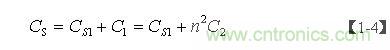 【1-4】式中,Cs為變壓器的總分布電容,Cs1為變壓器初級線圈的分布電容;而C1為次級線圈電路中所有電容等效到初級線圈電路中的電容;C2為次級線圈電路中所有電容(包括分布電容與電路中的電容);n = N2/N1為變壓比。
