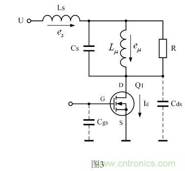 在圖2中,Ls為漏感,漏感也稱漏磁電感,或稱分布電感;Cs為分布電容(總分布電容), Lu為勵磁電感,R為等效負載電阻。設開關變壓器初級線圈的電感為L,則L=Ls+Lu ;而分布電容Cs,則包括次級線圈等效到初級線圈一側的分布電容,即,次級線圈的分布電容也要等效到初級線圈回路中;同理,等效負載電阻R,就是次級線圈的負載RL被等效到初級線圈回路中的電阻。