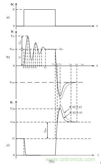 這裏順便指出,圖6-b的波形是很難測量到的,因為分布電感Ls與分布電容Cs產生自由振蕩的過程,基本上都在變壓器內部的分布電感與分布電容之間進行,用儀器很難直接進行測量;但通過測量變壓器次級線圈的波形,也可以間接測量圖6-b中波形的振幅;而圖6-c的波形可以直接進行測量,兩者的振幅均與分布電感Ls的數值大小有關,還與等效電阻R的阻值有關。分布電感Ls的數值越大,振幅也越大,等效電阻R的阻值越大,振幅也越大。