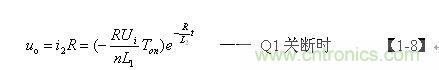 【1-8】式中,L1、L2分別為開關變壓器初、次級線圈的電感,n為開關變壓器線圈的匝數比,n=N2/N1,Ui為變壓器初級線圈的輸入電壓,Ton為開關管的導通時間,R為等效負載電阻。