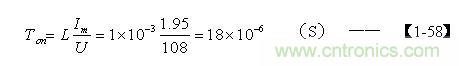 當占空比等於0.5時,對應的輸入電壓U為108V,對應的最大電流Im為1.95A,假設開關變壓器初級線圈的電感量L=1000uH,根據【1-45】式,可求得Ton的值為: