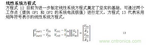Vcs1 和 Vcs2 可通過方程式 4 確定。請選擇 R2 的值。最佳實踐是選擇已經存在於電源設計中的值,因為這有助於確保網絡穩定性。轉換器的反饋電壓 Vfb 可在穩壓器產品說明書中找到。這樣我們可手動或用數學工具解算線性係統方程式,結果就是 G1 和 GM 電導值。反過來,其結果就是 R1 和 RM。