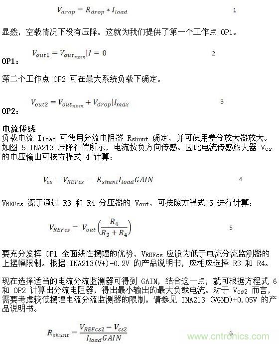 如圖 5 所示,用電流分流監測器 INA213 測量電流可實施壓降補償。電壓輸出 Vcs 通過 Rm 反饋至轉換器的反饋電阻器網絡。轉換器塊 P1 說明了控製環路非常基本的原理。反饋 FB 好比參考電壓,而 Vout 通過致動器方案調節,這裏 FB 就是 VREF。因此,反饋電壓 FB 可視為恒定,而且等於轉換器的 VREF,其可用作所有計算的基礎。通過分流電阻器 Rs 的負載電流 Iload 的反向測量是應用的關鍵。如果在負載電流 Iload 上升時要讓 Vout 上升,那麼電流分流監測器的輸出電壓 Vcs 就需要降低。在空載條件下 Vcs 是 VREF。如果負載提升,Vcs 會下降,而 Vout 則會相應上升。這正是我們想要的結果。