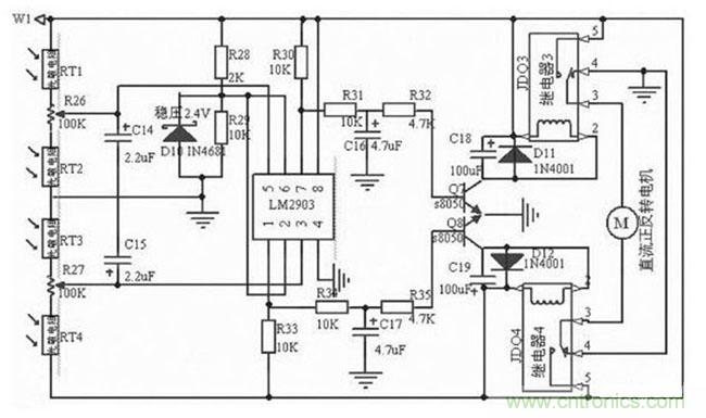 控(kong)製(zhi)器(qi)的(de)輸(shu)入(ru)端(duan),光(guang)敏(min)傳(chuan)感(gan)器(qi)分(fen)別(bie)由(you)兩(liang)隻(zhi)光(guang)敏(min)電(dian)阻(zu)串(chuan)聯(lian)交(jiao)叉(cha)組(zu)合(he)而(er)成(cheng)。每(mei)一(yi)組(zu)兩(liang)隻(zhi)光(guang)敏(min)電(dian)阻(zu)中(zhong)的(de)一(yi)隻(zhi)為(wei)比(bi)較(jiao)器(qi)的(de)上(shang)偏(pian)置(zhi)電(dian)阻(zu),另(ling)一(yi)隻(zhi)為(wei)下(xia)偏(pian)置(zhi)電(dian)阻(zu)。一(yi)隻(zhi)檢(jian)測(ce)太(tai)陽(yang)光(guang)照(zhao),另(ling)一(yi)隻(zhi)則(ze)檢(jian)測(ce)環(huan)境(jing)光(guang)照(zhao),送(song)至(zhi)比(bi)較(jiao)器(qi)輸(shu)入(ru)端(duan)的(de)比(bi)較(jiao)電(dian)平(ping)始(shi)終(zhong)為(wei)兩(liang)者(zhe)光(guang)照(zhao)之(zhi)差(cha)。具(ju)體(ti)電(dian)路(lu)如(ru)圖(tu)4 所示:光敏電阻RT1 , RT2 與電位器R27 和光敏電阻RT3 , RT4 與電位器R28 分別構成光敏傳感電路。將RT1 和RT3 安裝在垂直遮陽板的一側, RT4 和RT2 安裝在另一側。當RT1 , RT2 , RT3 和RT4 同時受環境自然光線作用時,R27 和R28 的中心點電壓不變。當隻有RT1 ,RT3 受太陽光照射, RT1 的內阻減小, LM 2903 的5 腳電位升高, 7 腳輸出高電平, 三極管Q7 導通,JDQ 4 工作,其觸點3, 5 閉合。同時RT3 內阻減小, LM 2903 的3 腳電位下降, JDQ 5 不工作,電機M 正轉;當隻有RT2 , RT4受太陽光照射,同理,電機M 反轉。當轉到垂直遮陽板兩側的光照度相同時,JDQ 4, JDQ 5 都導通,電機M 才(cai)停(ting)轉(zhuan)。在(zai)太(tai)陽(yang)不(bu)停(ting)地(di)偏(pian)移(yi)過(guo)程(cheng)中(zhong),垂(chui)直(zhi)遮(zhe)陽(yang)板(ban)兩(liang)側(ce)光(guang)照(zhao)度(du)的(de)強(qiang)弱(ruo)不(bu)斷(duan)地(di)交(jiao)替(ti)變(bian)化(hua),電(dian)機(ji)不(bu)停(ting)的(de)運(yun)動(dong),使(shi)太(tai)陽(yang)能(neng)接(jie)收(shou)裝(zhuang)置(zhi)始(shi)終(zhong)麵(mian)朝(chao)太(tai)陽(yang)。