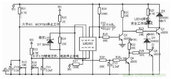 當鋰電池電壓低於315V 時,即電池電量釋放92%以yi上shang時shi,認ren為wei不bu能neng繼ji續xu放fang電dian,否fou則ze鋰li電dian池chi內nei部bu介jie質zhi會hui發fa生sheng變bian化hua,致zhi使shi充chong電dian特te性xing變bian壞huai,容rong量liang降jiang低di等deng。為wei此ci設she計ji過guo放fang電dian保bao護hu控kong製zhi電dian路lu,此ci電dian路lu的de具ju體ti設she計ji如ru圖tu3,分析如下:采用了LM 2903的1,2,3 腳組成的一路比較器,與外圍器件構成過放電壓比較器,R12 , R14分壓後接至LM 2093 的3 腳。當電壓值小於315V 時,分壓值小於214V,LM 2903的1 腳由高電平轉變為低電平, Q4 由導通轉變為截止狀態, Q6 飽和導通,JDQ2 工作,同時過放紅色指示燈亮。