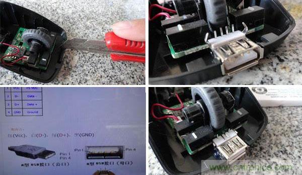 開USB座口,引腳定義,隻要兩邊的兩個腳,也就是+5V和地。