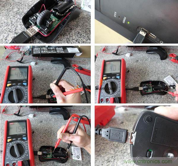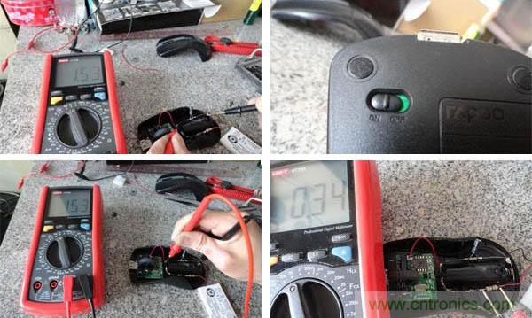 在萬用表測試後,我們能夠看到接入後USB電壓為4.87V,鋰電池兩端為4.01V。負載端為1.52V,再次打開鼠標電源開關。出現1.54V,竟然還高了,這個應該關係到阻抗和容抗問題,水平不夠,不好解釋,反正就當它正常了。
