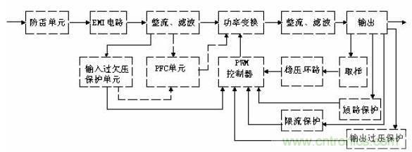 開關電源的主要電路是由輸入電磁幹擾濾波器(EMI)、整流濾波電路、功率變換電路、PWM控製器電路、輸出整流濾波電路組成。輔助電路有輸入過欠壓保護電路、輸出過欠壓保護電路、輸出過流保護電路、輸出短路保護電路等。開關電源的電路組成方框圖如下: