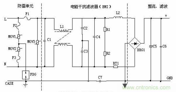 ① 輸入濾波電路:C1、L1、C2組成的雙π型濾波網絡主要是對輸入電源的電磁噪聲及雜波信號進行抑製,防止對電源幹擾,同時也防止電源本身產生的高頻雜波對電網幹擾。C3、C4為安規電容,L2、L3為差模電感。