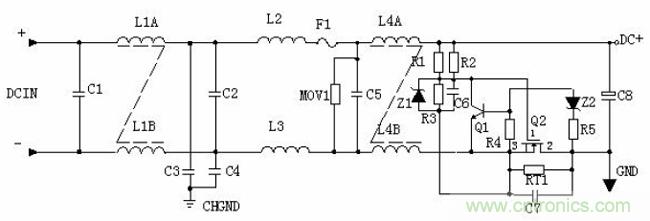 ② R1、R2、R3、Z1、C6、Q1、Z2、R4、R5、Q2、RT1、C7組成抗浪湧電路。在起機的瞬間,由於C6的存在Q2不導通,電流經RT1構成回路。當C6上的電壓充至Z1的穩壓值時Q2導通。如果C8漏電或後級電路短路現象,在起機的瞬間電流在RT1上產生的壓降增大,Q1導通使Q2沒有柵極電壓不導通,RT1將會在很短的時間燒毀,以保護後級電路。