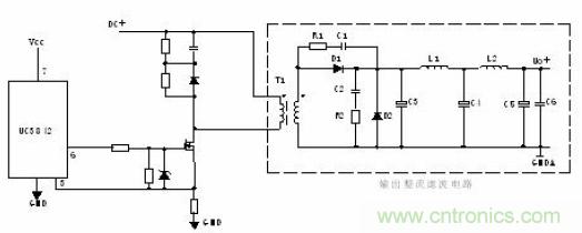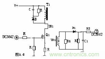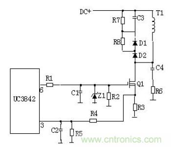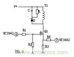 R4、C3、R5、R6、C4、D1、D2組成緩衝器,和開關MOS管並接,使開關管電壓應力減少,EMI減少,不發生二次擊穿。在開關管Q1關斷時,變壓器的原邊線圈易產生尖峰電壓和尖峰電流,這些元件組合一起,能很好地吸收尖峰電壓和電流。從R3測得的電流峰值信號參與當前工作周波的占空比控製,因此是當前工作周波的電流限製。當R5上的電壓達到1V時,UC3842停止工作,開關管Q1立即關斷。