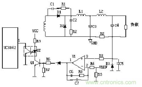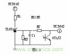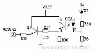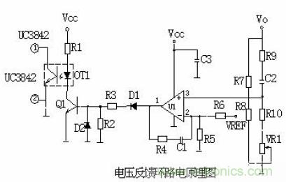當輸出U0降低時,U1③腳電壓降低,當其低過U1②腳基準電壓後U1①腳輸出低電平,Q1不導通,光耦OT1發光二極管不發光,光電三極管不導通,UC3842①腳電位升高,從而改變U1⑥腳輸出占空比增大,U0降低。周而複始,從而使輸出電壓保持穩定。調節VR1可改變輸出電壓值。