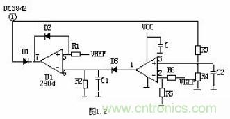 取樣電壓分為兩路,一路經R1、R2、R3、R4分壓後輸入比較器3腳,如取樣電壓高於2腳基準電壓,比較器1腳輸出高電平去控製主控製器使其關斷,電源無輸出。另一路經R7、R8、R9、R10分壓後輸入比較器6腳,如取樣電壓低於5腳基準電壓,比較器7腳輸出高電平去控製主控製器使其關斷,電源無輸出。