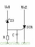 如上圖,當Uo1輸出升高,穩壓管(Z3)擊穿導通,可控矽(SCR1)的控製端得到觸發電壓,因此可控矽導通。Uo2電dian壓ya對dui地di短duan路lu,過guo流liu保bao護hu電dian路lu或huo短duan路lu保bao護hu電dian路lu就jiu會hui工gong作zuo,停ting止zhi整zheng個ge電dian源yuan電dian路lu的de工gong作zuo。當dang輸shu出chu過guo壓ya現xian象xiang排pai除chu,可ke控kong矽gui的de控kong製zhi端duan觸chu發fa電dian壓ya通tong過guoR對地泄放,可控矽恢複斷開狀態。
