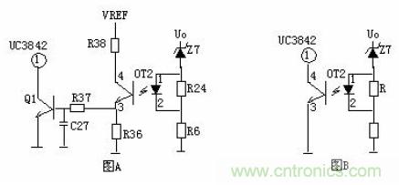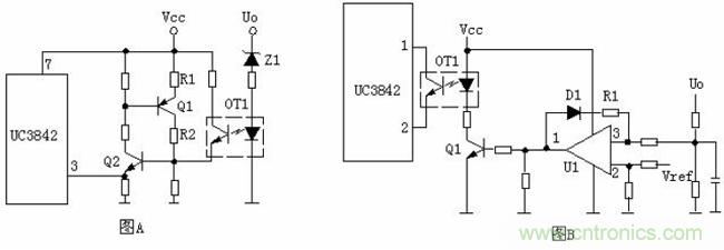 圖A的工作原理是,當輸出電壓Uo升高,穩壓管導通,光耦導通,Q2基極得電導通,由於Q2的導通Q1基極電壓降低也導通,Vcc電壓經R1、Q1、R2使Q2始終導通,UC3842③腳始終是高電平而停止工作。在圖B中,UO升高U1③腳電壓升高,①腳輸出高電平,由於D1、R1的存在,U1①腳始終輸出高電平Q1始終導通,UC3842①腳始終是低電平而停止工作。正反饋?