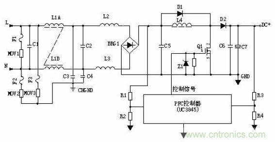 輸入電壓經L1、L2、L3等組成的EMI濾波器,BRG1整流一路送PFC電感,另一路經R1、R2分壓後送入PFC控製器作為輸入電壓的取樣,用以調整控製信號的占空比,即改變Q1的導通和關斷時間,穩定PFC輸出電壓。L4是PFC電感,它在Q1導通時儲存能量,在