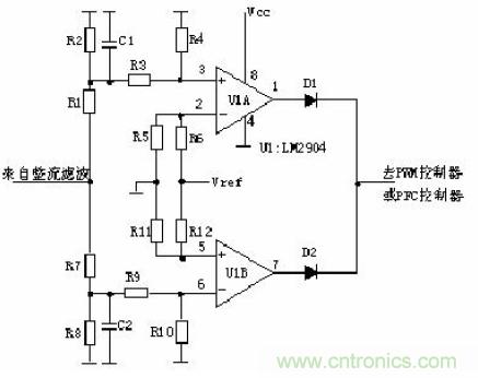 Q1關斷時施放能量。D1是啟動二極管。D2是PFC整流二極管,C6、C7濾波。PFC電壓一路送後級電路,另一路經R3、R4分壓後送入PFC控製器作為PFC輸出電壓的取樣,用以調整控製信號的占空比,穩定PFC輸出電壓。