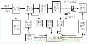 圖1示出電源原理框圖,整個電路可分為主電路(電力變換電路)和控製電路兩大部分。來自電網的380V交流電壓經整流濾波後得到約520V左右的直流電壓,加到橋式逆變器上。逆變器主功率開關采用三菱公司的CT60型IGBT管。PWM電路產生一對相位互差180°的脈衝電壓控製逆變橋的四個功率管,將直流電壓變換為高頻方波電壓,再經高頻高壓整流橋得到高壓直流(約1400V),向儲能電容Co充電。電容Co上電壓充到預定值(1000V)後,控製電路發出信號,將放電晶閘管觸發導通,Co上電壓快速向負載氙燈釋放,激光器正常工作。