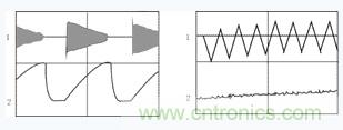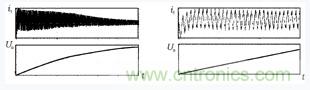 圖6為實測波形,(b)圖示出(a)圖的前幾個周期。圖中上部是變壓器原邊電源i1波形,下部是儲能電容U0的電壓波形,與圖3仿真波形對應。由圖中看出,i1為零後,U0並未立刻下降,而是保持一段時間,這是因為充放電時間固定的緣故,當U0達到預定值後保持至充電時間終了。