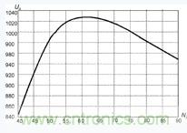 圖5中,橫坐標表示變壓器副邊繞組匝數N2,縱坐標表示輸出電壓U0,在L=100μH,Ui=520V,f=20kHz,N2=60時,輸出電壓U0為峰值。