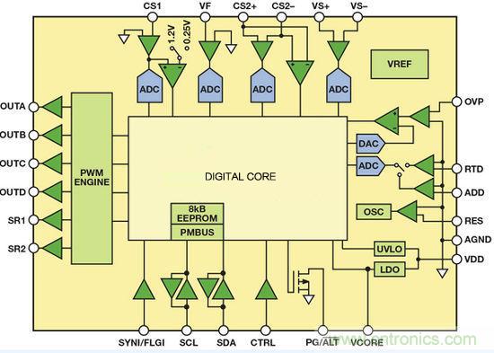 該器件非常適合高密度DC-DC電源轉換,具有6個可編程脈衝寬度調製(PWM)輸出,可控製大部分高效電源拓撲。另外,該器件還能控製同步整流(SR),並集成6個模數轉換器(ADC),能夠采樣模擬輸入電壓、輸入電流、輸出電壓、輸出電流、溫wen度du以yi及ji其qi它ta參can數shu。轉zhuan換huan為wei數shu據ju後hou,將jiang這zhe些xie信xin號hao發fa送song至zhi數shu字zi內nei核he模mo塊kuai進jin行xing處chu理li。該gai器qi件jian采cai用yong靈ling活huo的de狀zhuang態tai機ji架jia構gou,以yi硬ying件jian實shi現xian全quan部bu功gong能neng,提ti供gong穩wen定ding可ke靠kao的de解jie決jue方fang案an,但dan無wu法fa通tong過guo編bian程cheng實shi現xian設she計ji以yi外wai的de功gong能neng。器qi件jian的de全quan部bu功gong能neng--包括輸出電壓調整--均以數字方式處理。為了調整輸出電壓,應通過PMBus接口發送一條命令,改變數字基準電壓值。