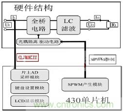 考慮到係統效率,不需要進行boost升壓,可以直接逆變。故本係統結構圖如圖1所示。SPWM信號控製硬件全橋電路,然後經過LC濾波電路可以得到正弦波。以MSP430單片機為核心的數字控製係統需要采樣電流量、控製硬件電路係統以及形成良好的人際交互界麵。